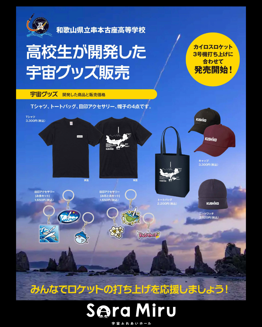 情報ページ グッズ 🚀【高校生が開発した宇宙グッズ販売】 2026.02.18 🚀【高校生が開発した宇宙グッズ販売】 2月25日、カイロスロケット3号機打ち上げにあわせて、 和歌山県立串本古座高等学校〈宇宙探求コース〉の生徒たちが開発した 宇宙グッズを販売します。 Tシャツ、トートバッグ、目印アクセサリー、帽子など ロケットのまち・串本ならではのオリジナルアイテム。 ✅️打ち上げの記念に。 ✅️応援する気持ちを、カタチに。 みんなでロケットの打ち上げを応援しましょう🚀 📍販売場所:宇宙ふれあいホール ソラミル 📅2月25日より販売開始 × 団体向け 学校・教育旅行のご利用をご検討中の方へ Sora Miruでは、宇宙×学び×体験を組み合わせた団体向け見学プランをご用意しています。 学校・子供会・教育旅行・企業研修など、人数や目的に合わせた団体見学を受け付けています。 団体受け入れ体制のご案内あり モデルコース・所要時間を掲載 事前配布用の施設紹介チラシもダウンロード可能 団体受付・予約手続きはこちら 前の記事へ 新着情報一覧に戻る 次の記事へ