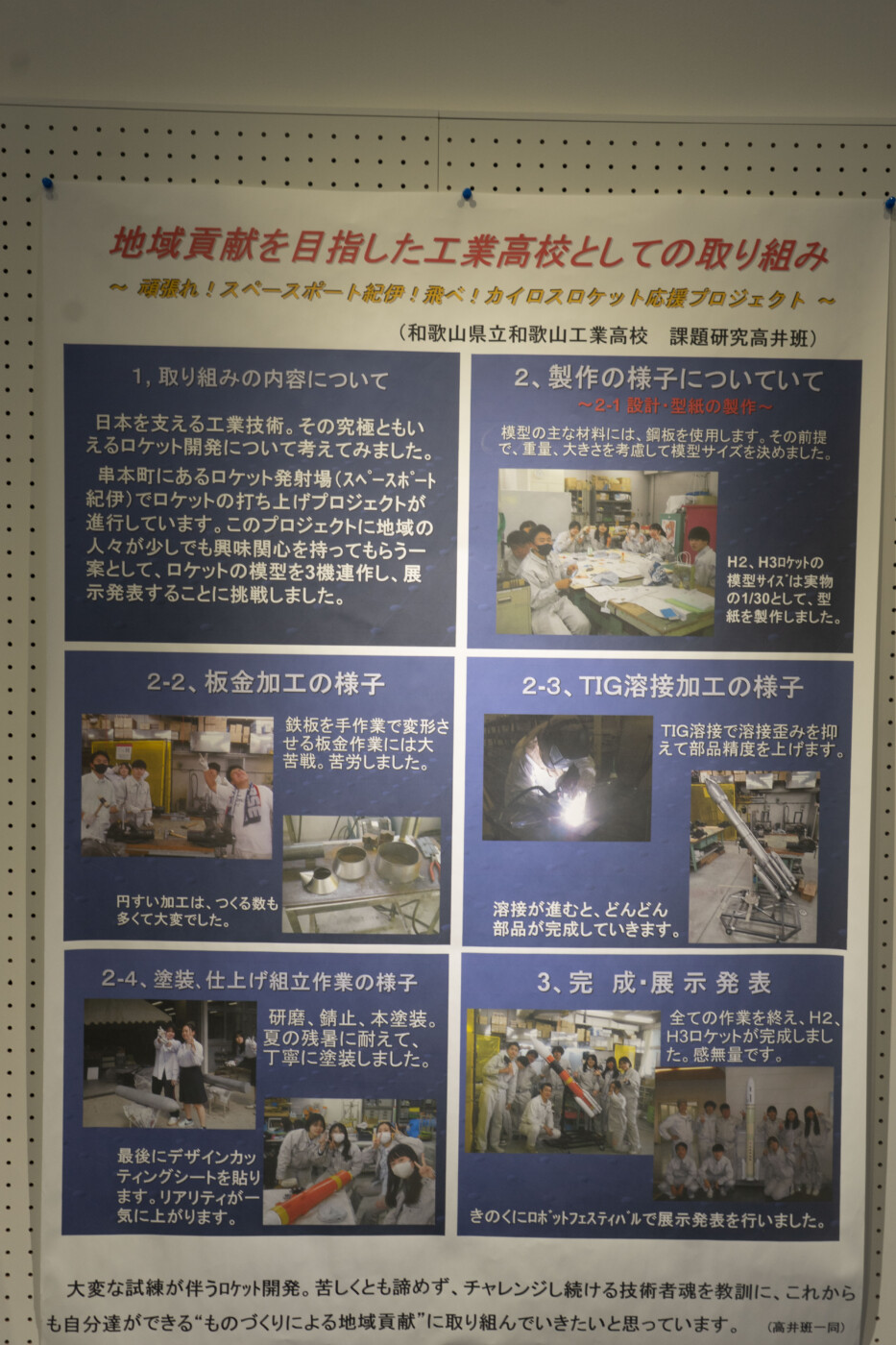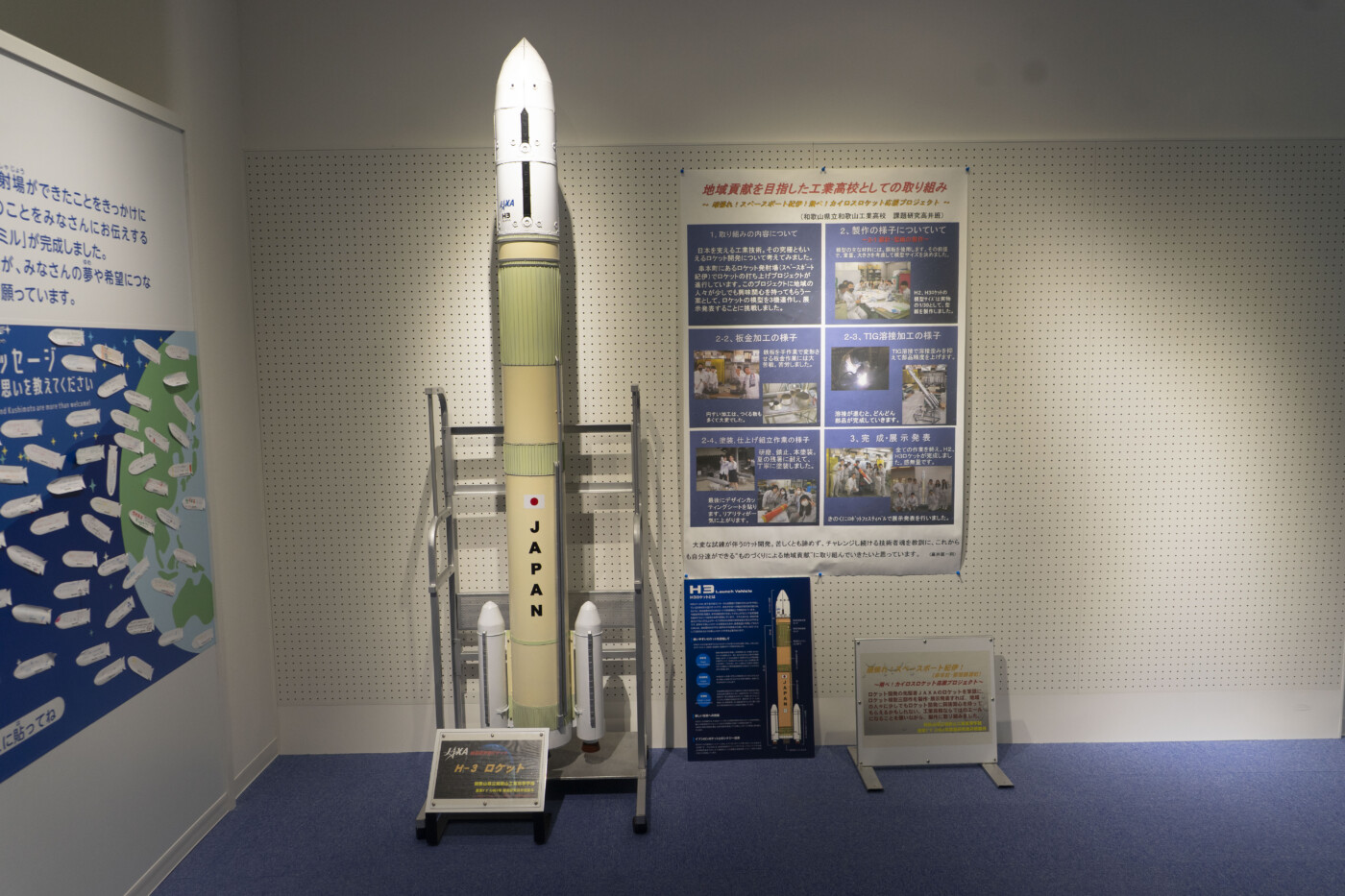 ZONE 6 宇宙とつながる場所スペースタウン串本 和歌山工業高校との協働プロジェクト 日本の基幹ロケットであるH3ロケットをモデルに、和歌山工業高校の生徒たちが製作したものです。 H3ロケットは、JAXAと三菱重工業が開発した日本の次世代大型ロケットで、 人工衛星の打ち上げや宇宙探査ミッションなど、幅広い用途に対応することを目的としています。 製作にあたっては、設計・板金加工・溶接・塗装・組み立てなどを分担し、 実際のロケットづくりを想定した工程を体験。 ものづくりを通して地域の宇宙プロジェクトに関わり、技術と情熱を形にしました。 この活動は「スペースポート紀伊」や「カイロスロケット応援プロジェクト」とも連動し、 地域と学校、そして宇宙開発をつなぐ取り組みとなっています。 PREV 施設案内に戻る Sora-Miru TOPに戻る NEXT