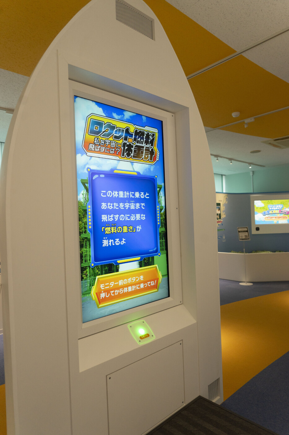 ZONE 2 ロケットものがたり ロケット燃料体重計 – 私を宇宙に飛ばすには? この体重計に乗ると、あなたを宇宙へ運ぶために必要な「燃料の重さ」が計算されます。 ロケットがどのくらいのエネルギーを使って宇宙へ飛ぶのか、実際に体験してみましょう! 遊び方 1. モニター前のボタンを押す 2. 体重計に乗る 3. あなたを宇宙へ飛ばすのに必要な燃料が表示される あなたの重さで必要な燃料がどのくらい変わるのか、ぜひ試してみてください! PREV 施設案内に戻る Sora-Miru TOPに戻る NEXT