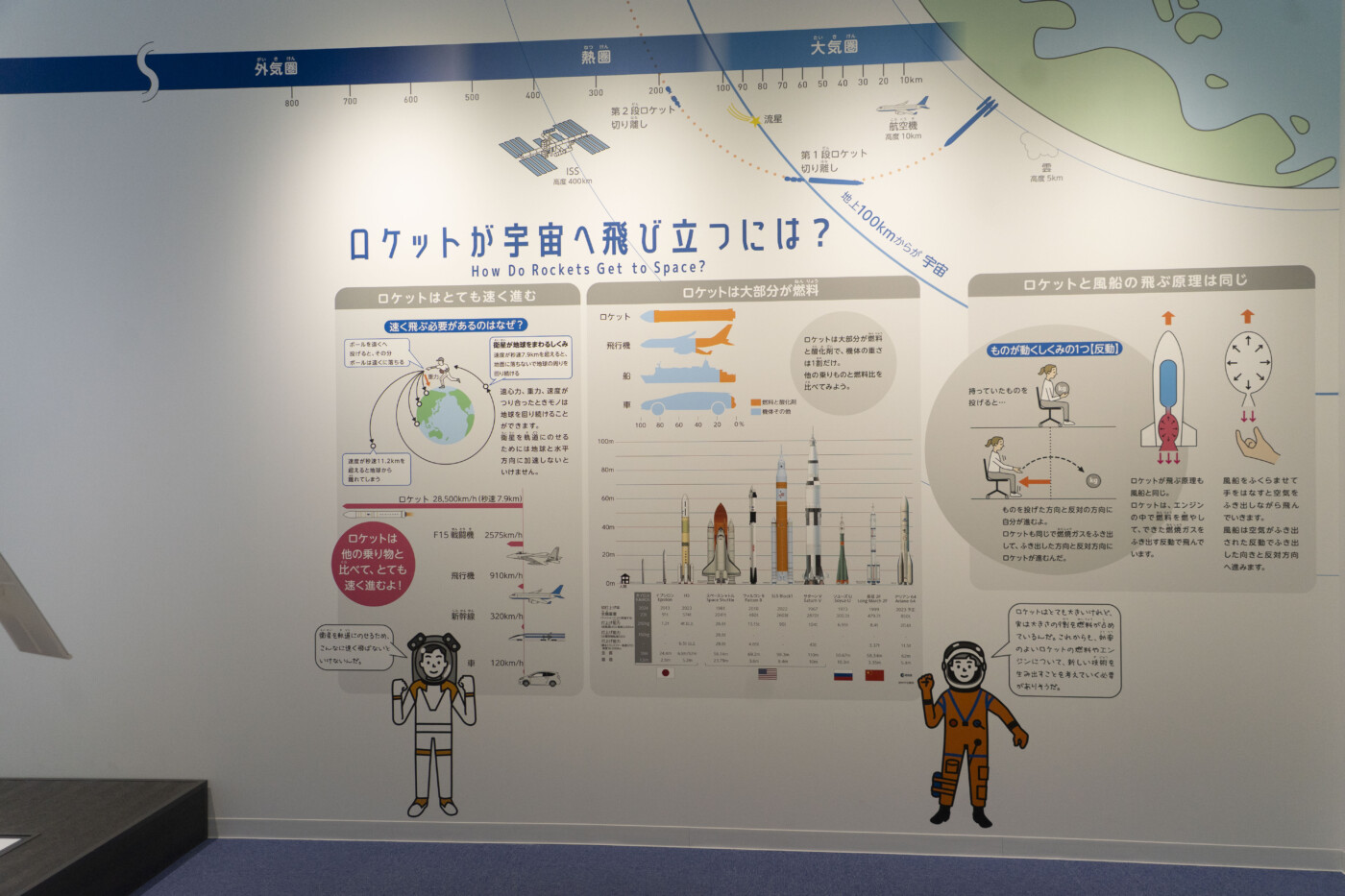 ZONE 2 ロケットものがたり ロケットが宇宙へ飛び立つには? ロケットは「反動」の力を利用して宇宙へ向かいます。風船の口を開けると 反対方向に飛ぶのと同じ原理で、燃料を燃やして噴射することで推進力を生み出します。 また、軽量化のために段階的にパーツを切り離しながら飛行し、 大気圏を突破して宇宙へ到達します。 このコーナーでは、ロケットの仕組みや飛行の工夫を分かりやすく解説! ロケットの不思議を一緒に学びましょう。 PREV 施設案内に戻る Sora-Miru TOPに戻る NEXT
