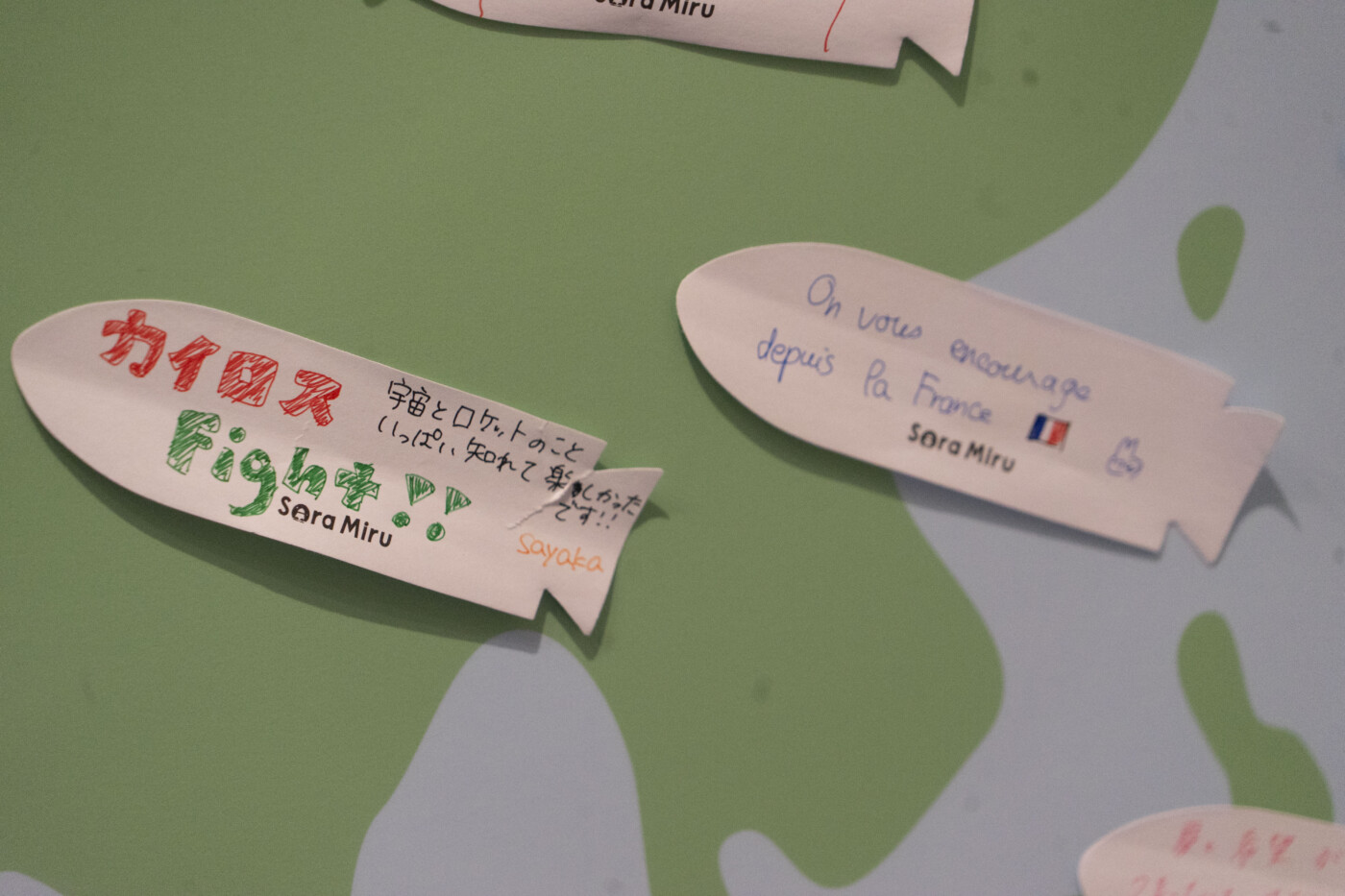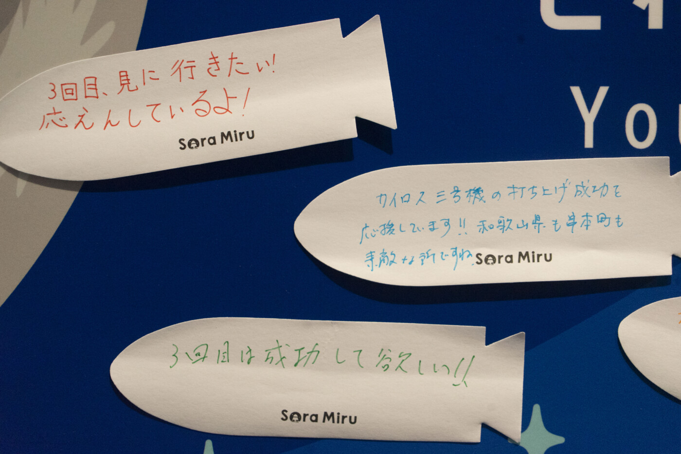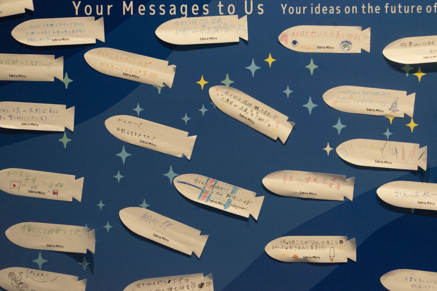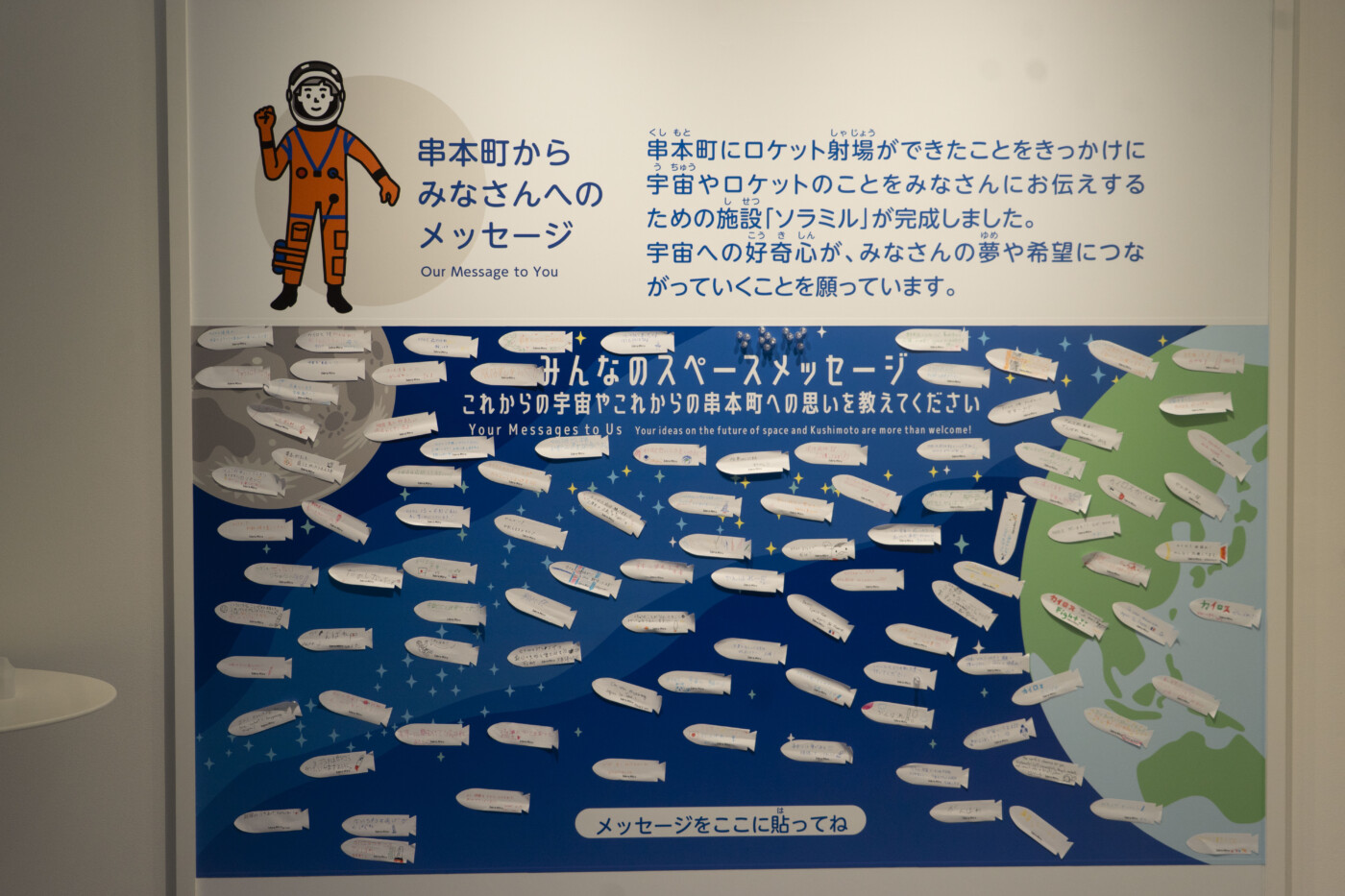 ZONE 6 宇宙とつながる場所スペースタウン串本 みんなのスペースメッセージ ロケット型のメッセージカードに、宇宙への想いや串本での感想を書いてみよう! 未来の宇宙開発を担う人たちへのエールを込めたり、 訪れた記念にメッセージを残したり。 他の来場者のメッセージも見ながら、宇宙への想いを共有しよう! ● 体験の流れ 1. ロケット型のメッセージカードに自由に書き込もう。 2. 書き終えたら、ロケットを未来へ飛ばす気持ちでボードへ貼り付けよう! 3. たくさんのメッセージが集まる「みんなのスペースメッセージ」を完成させよう! PREV 施設案内に戻る Sora-Miru TOPに戻る NEXT